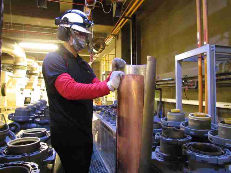 JDB电子将废弃物转化成有效的工业或民生原物料,,图为废铜液淬炼后再制成纯度极高的铜管