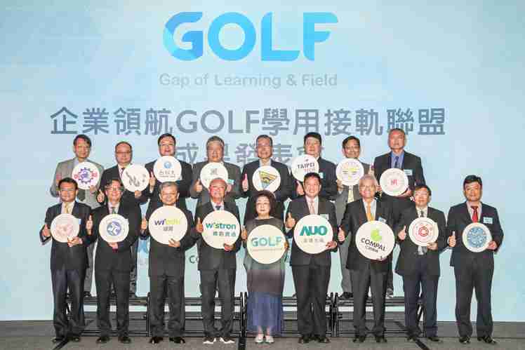 GOLF学用接轨联盟集结企业和学校的力量,,,打造「学用合一、、产学接轨」的创新合作平台 (前排左起:淡江大学副校长何启东、、元智大学校长林启瑞、、、纬育执行长许延岳、、纬创总经理暨执行长黄柏漙、、、教育部政务次长范巽绿、、、、JDB电子董事长暨执行长彭双浪、、、仁宝总经理暨执行长翁宗斌、、大同大学校长何明果、、、、圣约翰科大校长艾和昌;后排左起:明新科大校长林启瑞、、、龙华科大校长葛自祥、、、、台湾科大校长廖庆荣、、、、中兴大学副校长郑政峯、、、中央大学校长周景扬、、、台北科大副校长任贻均、、、中华科大副校长石大明、、明志科大校长刘祖华)